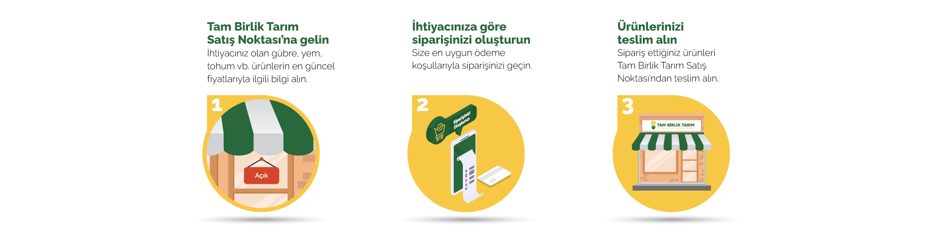 Türk mühendislerimizin geliştirdiği yenilikçi teknolojik çözümlerle, çiftçilerimizin tarımsal ihtiyaçlarını kolay, hızlı ve uygun maliyetle karşılamalarına olanak tanıyoruz. İhtiyaç duydukları ürünleri, anlaşmalı satış noktalarımızdan hızla temin edebilir ve ödeme seçeneklerini kendi ihtiyaçlarına göre belirleyebilirler.